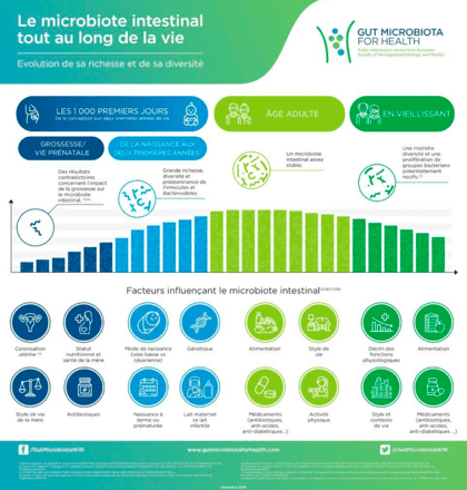 Cette infographie de GMFH illustre comment certains facteurs ont un impact sur le développement de notre microbiote intestinal .